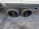The bathroom includes a shower, toilet, and vanity for convenience while traveling. The living area provides flexible seating options, and the large rear ramp doubles as a patio or loading area.